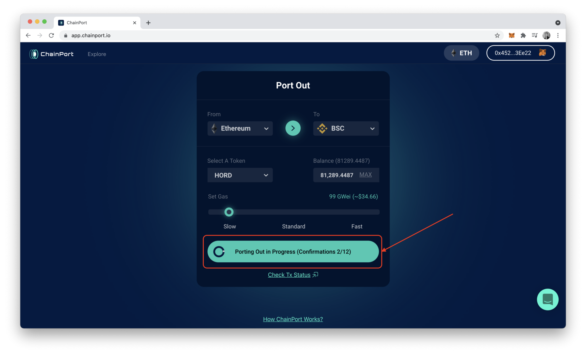 9. Click “Port XXX HORD From Ethereum to BSC”